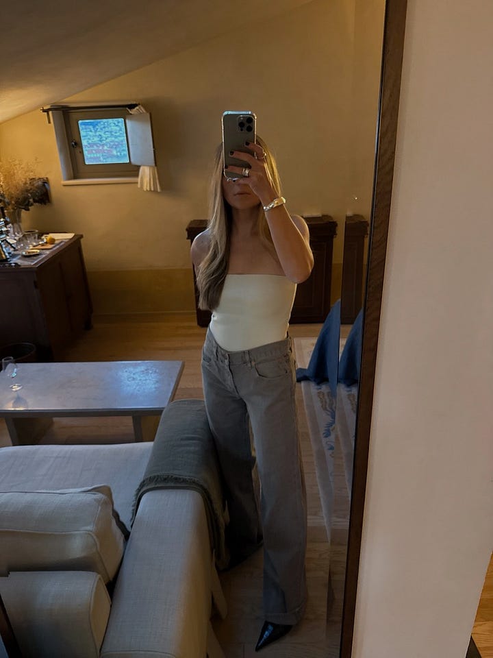 SHOP MY LOOK: Bustier Top, Green Jeans, Black Boot