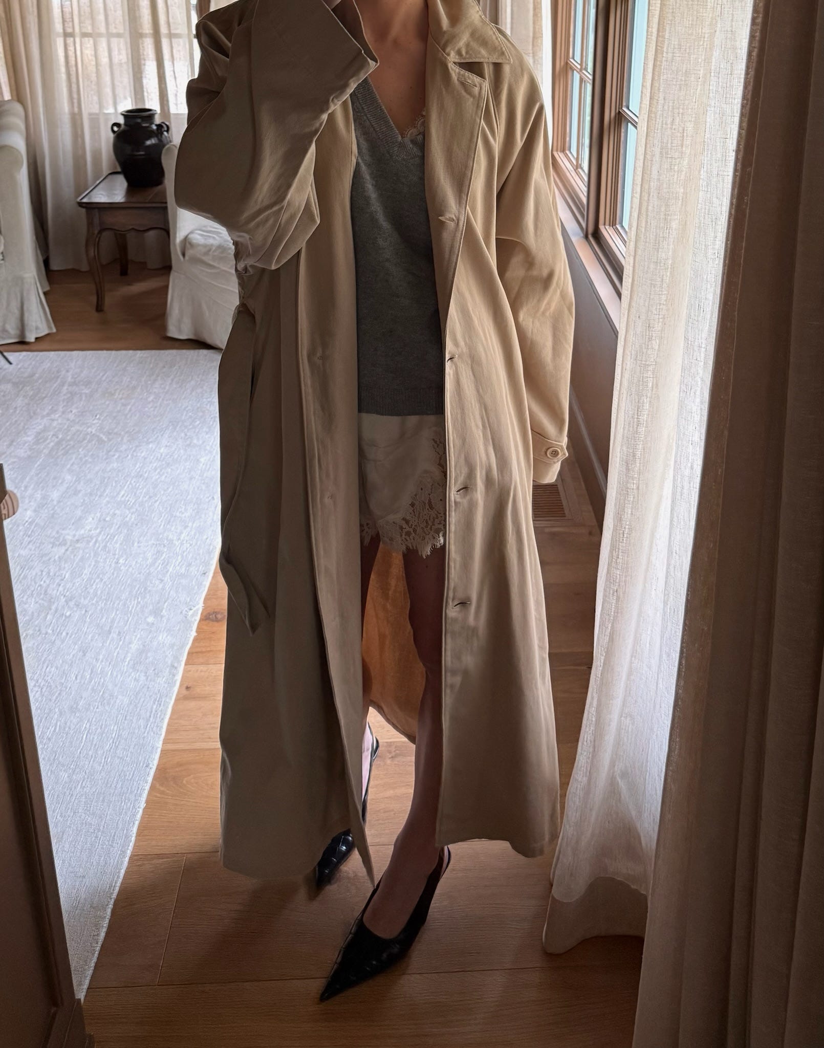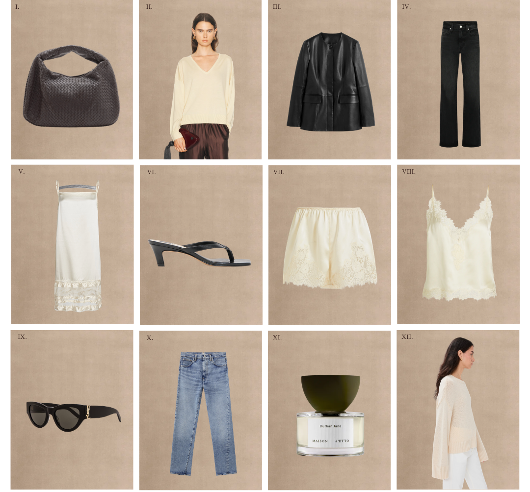 I. Pre-loved Bottega II. Butter V Neck III. Collarless Leather Jacket IV. Black Denim V. Slip Dress VI. Kitten Sandal VII. Lace Short VIII. Lace Cami IX. Sunnies X. Twisted Seam Denim XI. Favorite Fragrance XII. Crewneck Sweater